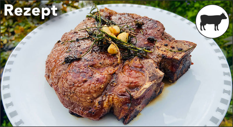 - Nachdem beide Seiten vom Steak angebraten sind reduzierst Du stark die Hitze für die Pfanne und legst die halbierten Knoblauchzehen und den Rosmarin neben das Steak in die Pfanne.