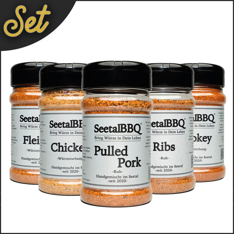 Set bestehend aus den fünf meistverkauftesten Gewürzen von Seetal BBQ.