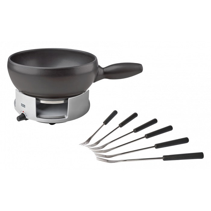 Set mit mit elektrischem Universalrechaud, Käsefonduecaquelon in schwarz und 6 Fonduegabeln mit schwarzem Kunststoffgriff. Das Rechaut erhitzt mit Induktion die Fonduepfanne.