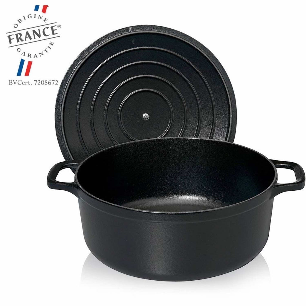 Der Bräter mit 29 cm Durchmesser und 5 Liter Fassungsvermögen wird aus hochwertigem Gusseisen in traditioneller Handarbeit in der französischen Champagne gefertigt. Seine exzellente Wärmespeicherung und gleichmäßige Hitzeverteilung machen ihn zum echten Küchenprofi – auf dem Herd, im Ofen oder auf dem Grill.