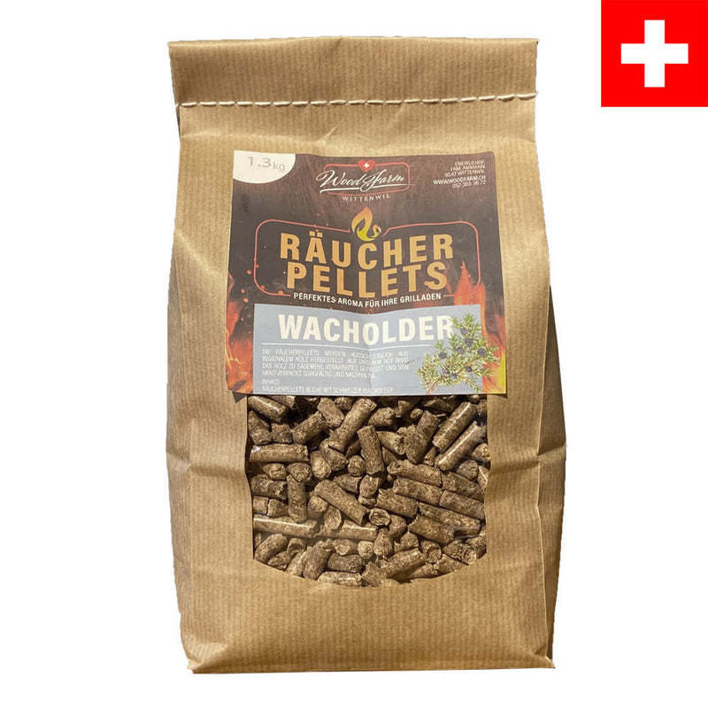 Genieße das robuste und würzige Aroma von Wacholderholz mit unseren Swiss Made Räucherpellets von Wood Farm. Hergestellt aus hochwertigem Wacholderholz aus der Schweiz, bieten diese Pellets ein intensives Raucharoma, das deinen Grillgerichten eine unverwechselbare Note verleiht. Perfekt für Rindfleisch, Wild und sogar für die Zubereitung von aromatischem Rauchsalz.