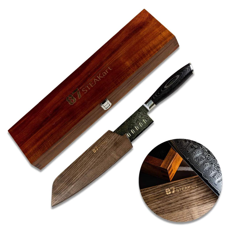 Das 87-STEAKart Damast Santokumesser von Azado ist ein vielseitiger Allrounder und ideal für präzise Schneidarbeiten. Mit seiner breiten und scharfen Klinge lassen sich Gemüse, Früchte, Kräuter, Fisch und Fleisch problemlos bearbeiten. Knochen und Tiefgefrorenes sollten jedoch nicht damit geschnitten werden.