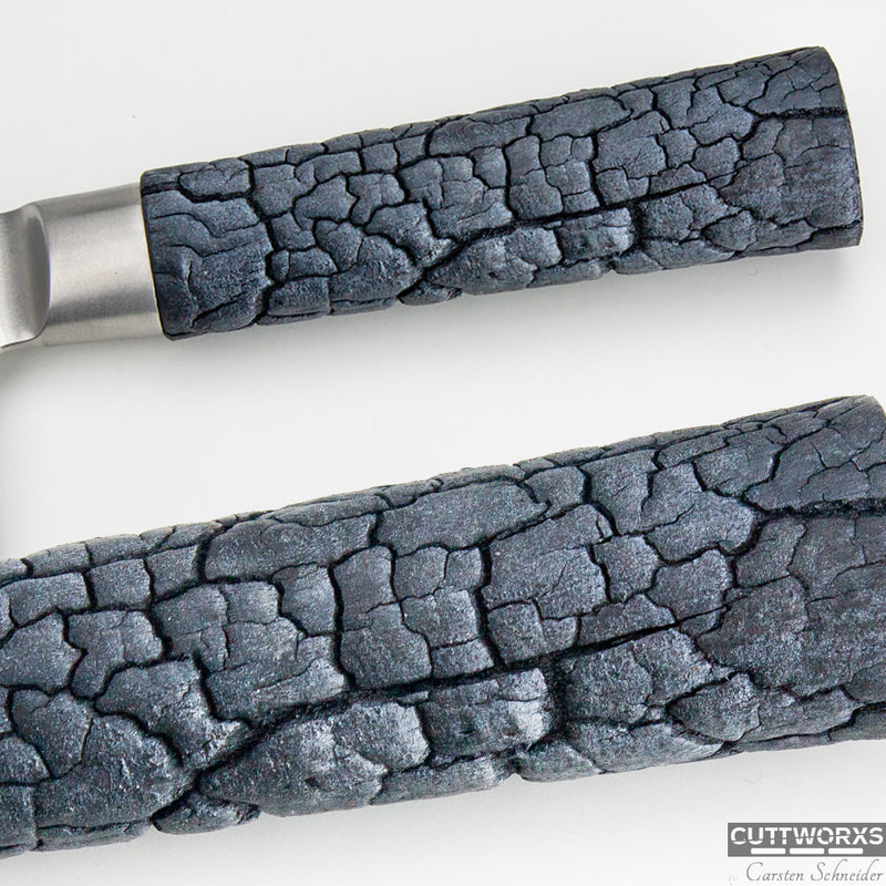 Die Klinge ist sehr dünn was die Handhabung vereinfacht. Zudem den typischen Cuttworxgriff aus verbranntem und behandeltem Holz.