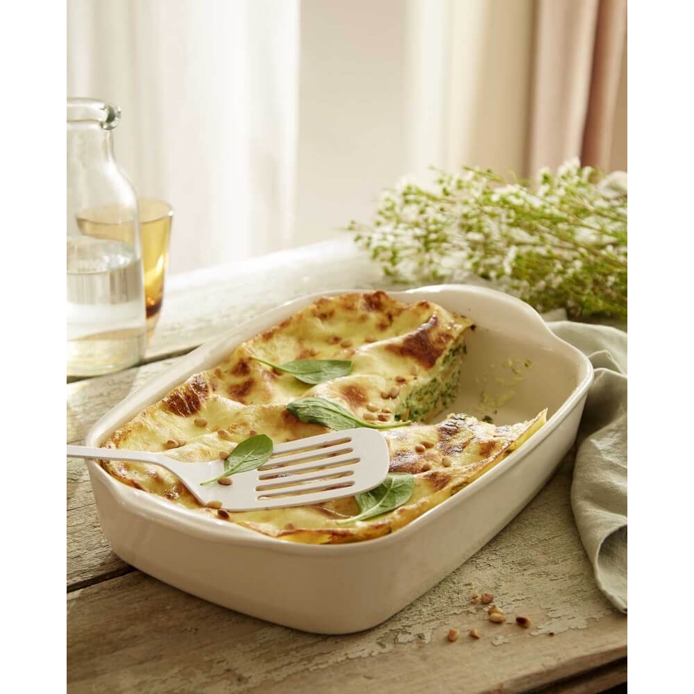 Die widerstandsfähige Glasur schützt die Form vor Kratzern und erleichtert die Reinigung – sowohl per Hand als auch in der Spülmaschine. Dank der ergonomischen Griffe lässt sich die Form sicher transportieren, egal ob aus dem Ofen direkt auf den Tisch oder in den Kühlschrank zur späteren Aufbewahrung.