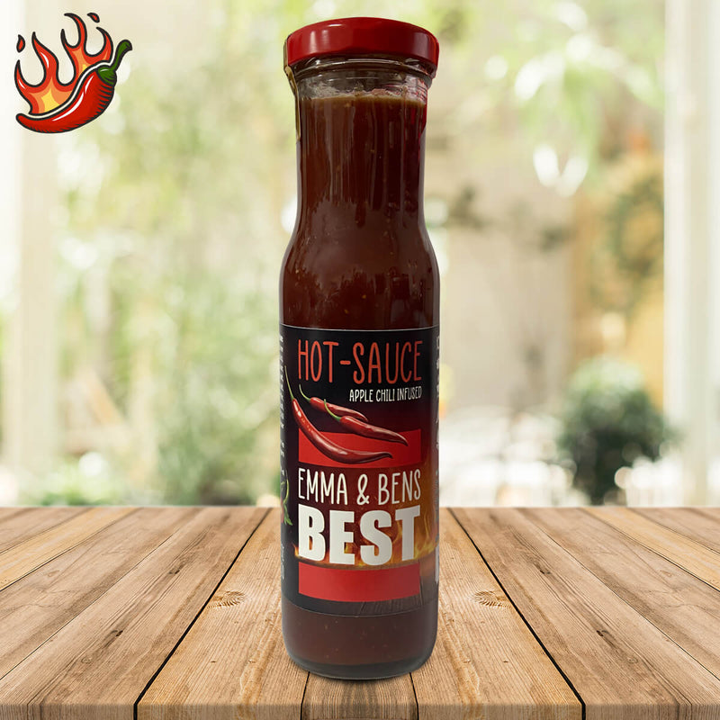 Unterstützt von der Familie und inspiriert durch positive Rückmeldungen, wurde das Projekt weiter vorangetrieben. Emma & Ben's Best Hot-Sauce ist das Ergebnis dieser Hingabe und Erfahrung. Probieren Sie diese einzigartige Hot-Sauce und genießen Sie die perfekte Kombination aus Apfel und Chili!