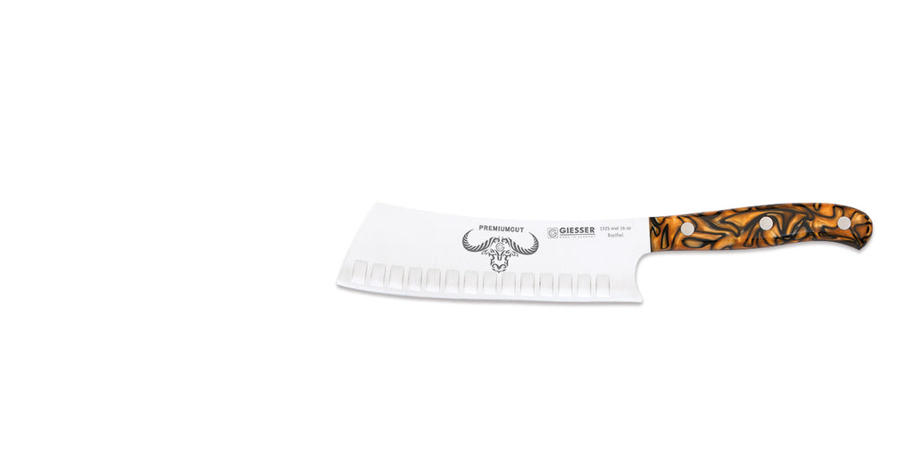 Spicy-Orange Die Exotik der Karibik, Gewürzspezialitäten oder nur Lifestyle – dieser Griff weckt sehr viele Emotionen bei seinem Betrachter oder Benutzer. Das besondere Herstellungsverfahren dieser Kunststoffgriffe ermöglicht es, dass kein Griff dem Anderen gleich ist. So wird jedes Messer zu einem besonderen Unikat und einem Werkzeug für all diejenigen, die das Besondere mögen.